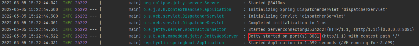 실행했을 때, Jetty starterd ~ 문구가 출력되어야 함
