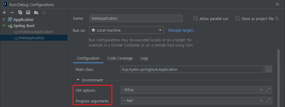 - Run/Debug Configurations -> Configuration -> VM options : -D로 들어옴