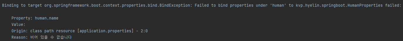 @NotEmpty를 사용했기 때문에 properties 파일에 "human.name =" 과 같이 name이 빈 값이라면