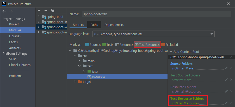 - File -> Project Structure -> Modules -> test/resources 디렉토리 클릭 -> Test Resources 클릭