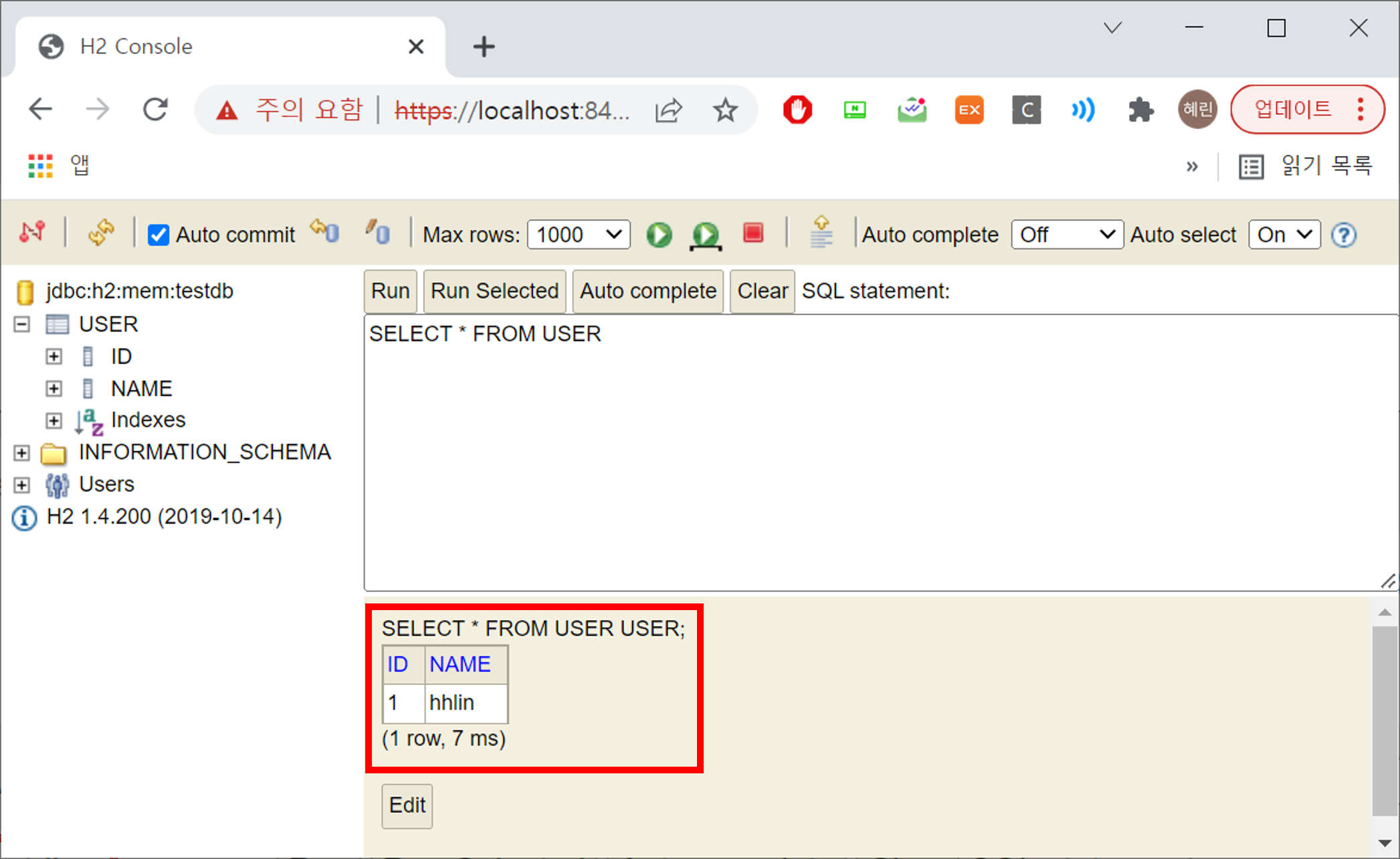 -> USER 테이블 생성 확인 가능