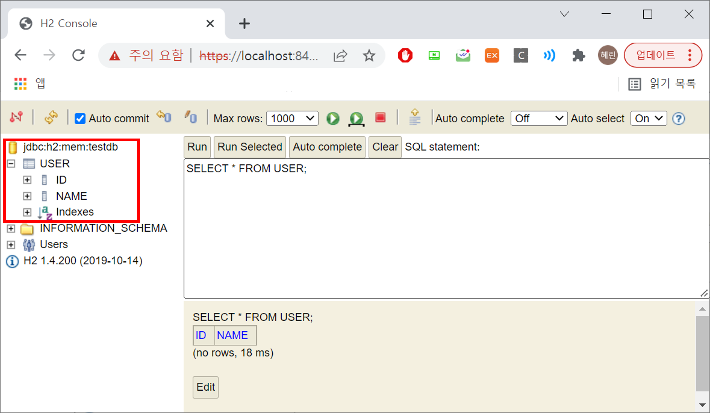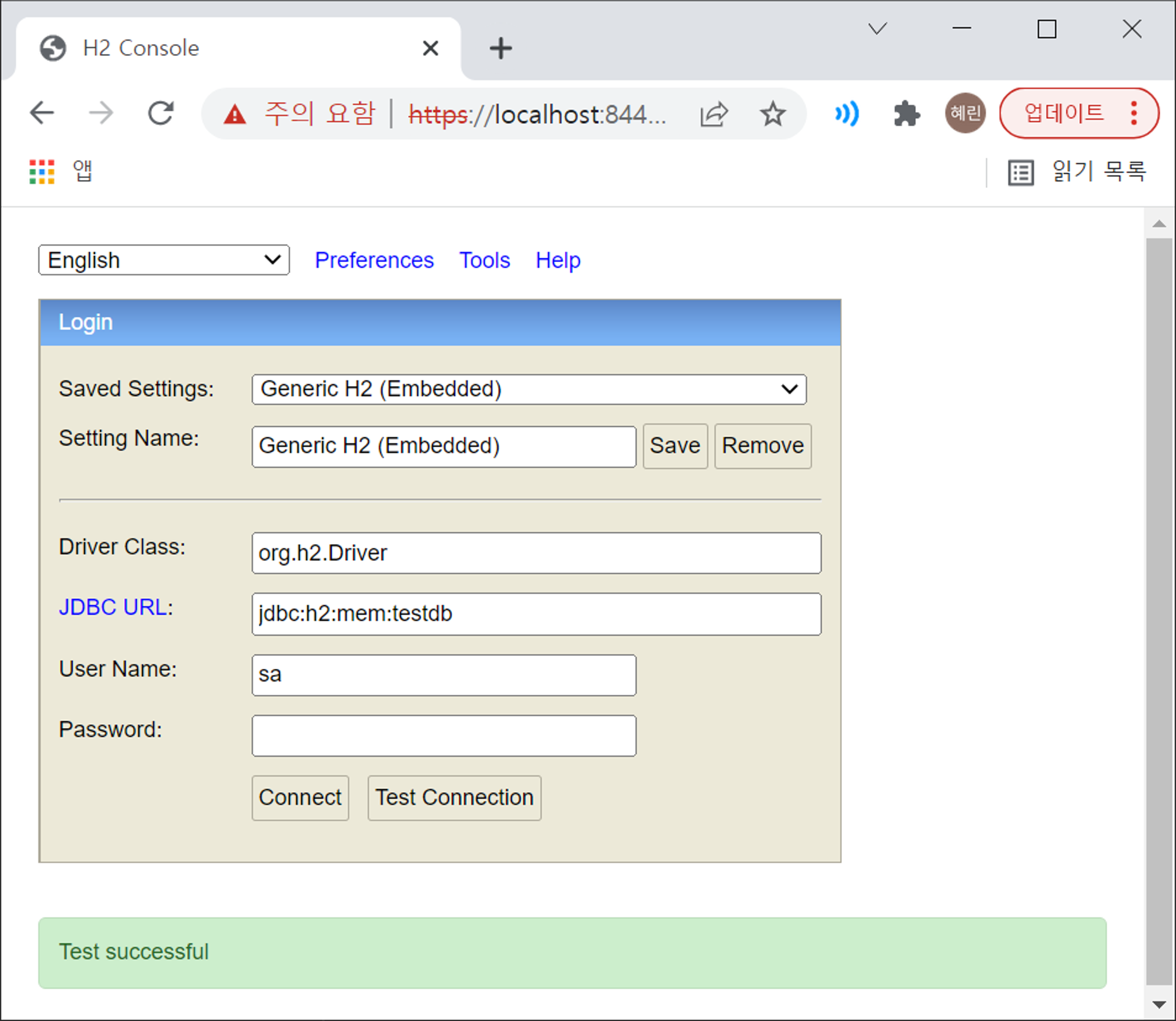 - /h2-console로 접속 (이 path도 바꿀 수 있음)