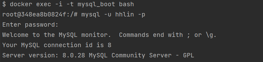 docker run -p 3306:3306 --name mysql_boot -e MYSQL_ROOT_PASSWORD=1 -e MYSQL_DATABASE=springboot -e MYSQL_USER=hhlin -e MYSQL_PASSWORD=pass -d mysql