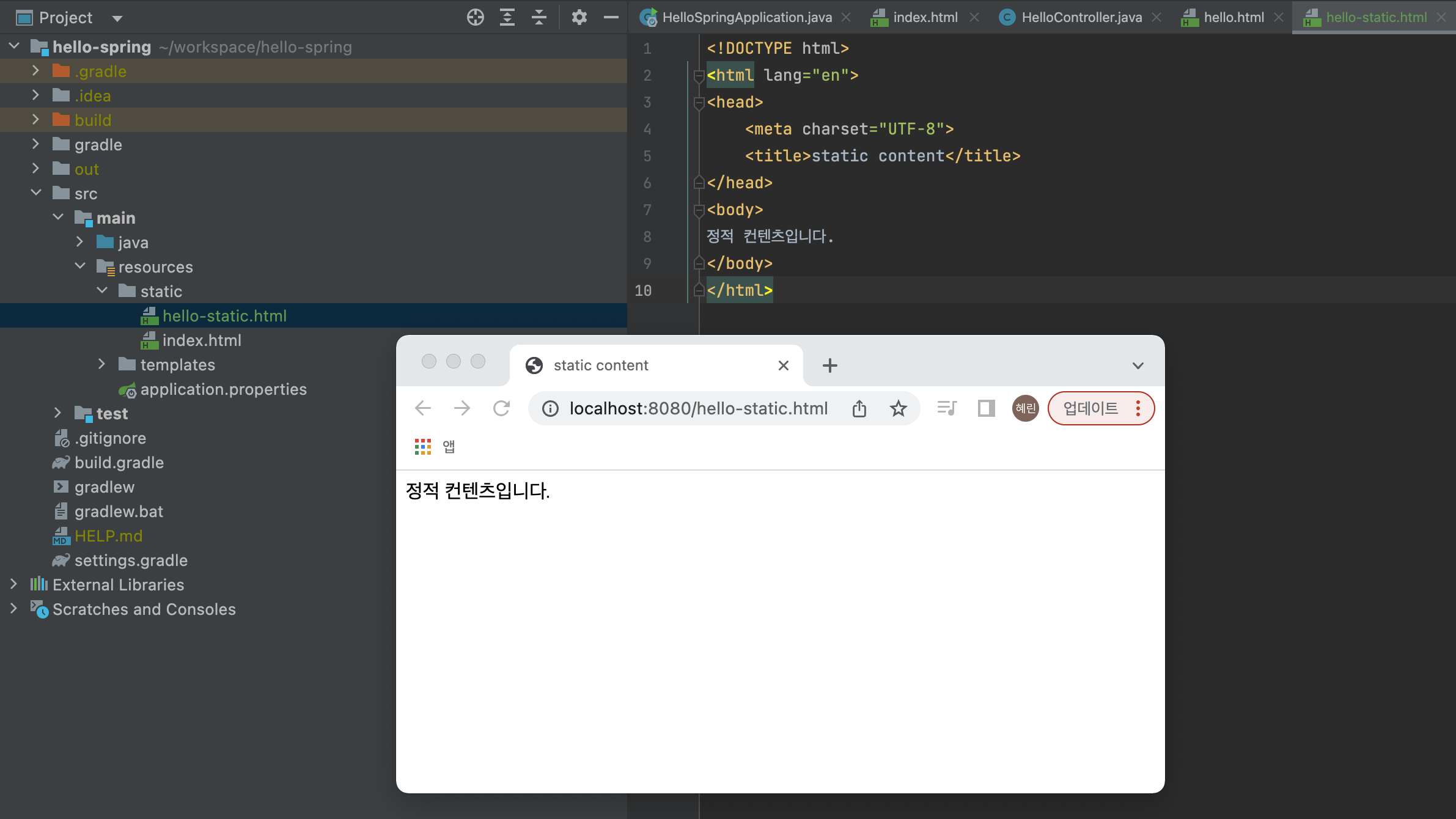 ① 웹 브라우저에서 localhost:8080/hello-static.html 요청