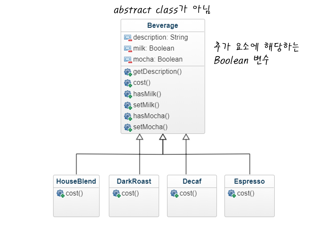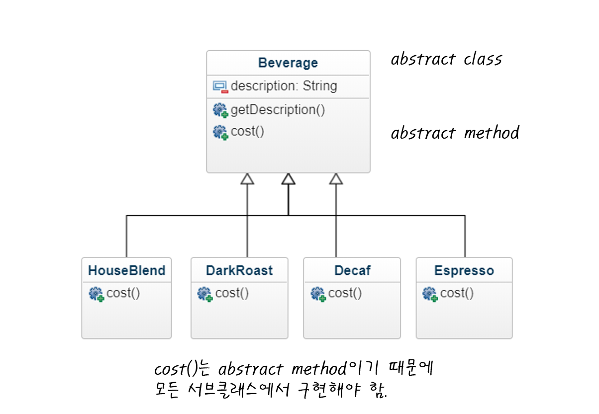 ☞ Beverage를 추상클래스로 선언한다면 모든 음료 메뉴에 대해 수많은 클래스가 생성되어야 함.
