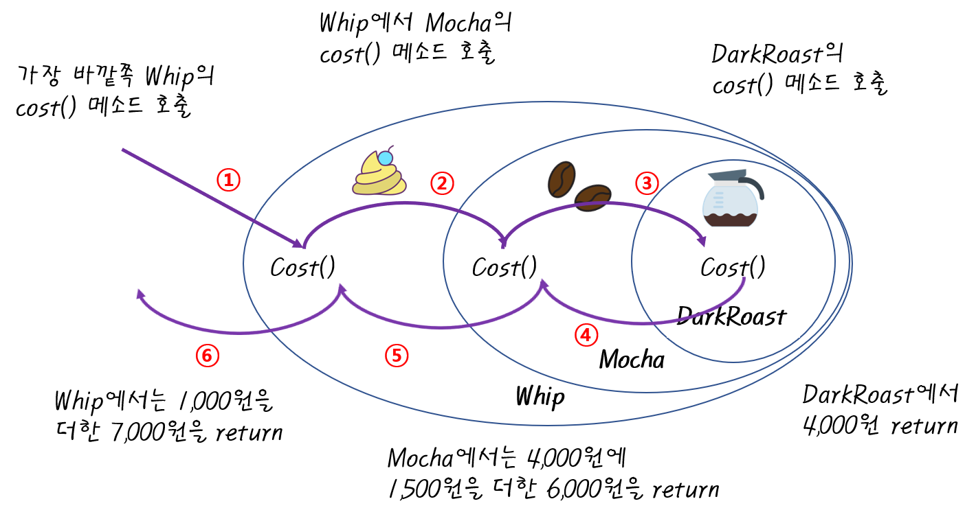 ④ cost() 메소드를 호출한다. 이 때, 첨가물의 가격을 계산하는 일은 해당 객체들에게 위임된다.