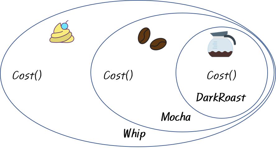 Mocha와 Whip으로 싸여 있는 DarkRoast는 여전히 Beverage 객체이기 때문에 cost() 메소드를 비롯한 DarkRoast에 대해 할 수 있는 것은 뭐든 할 수 있다.