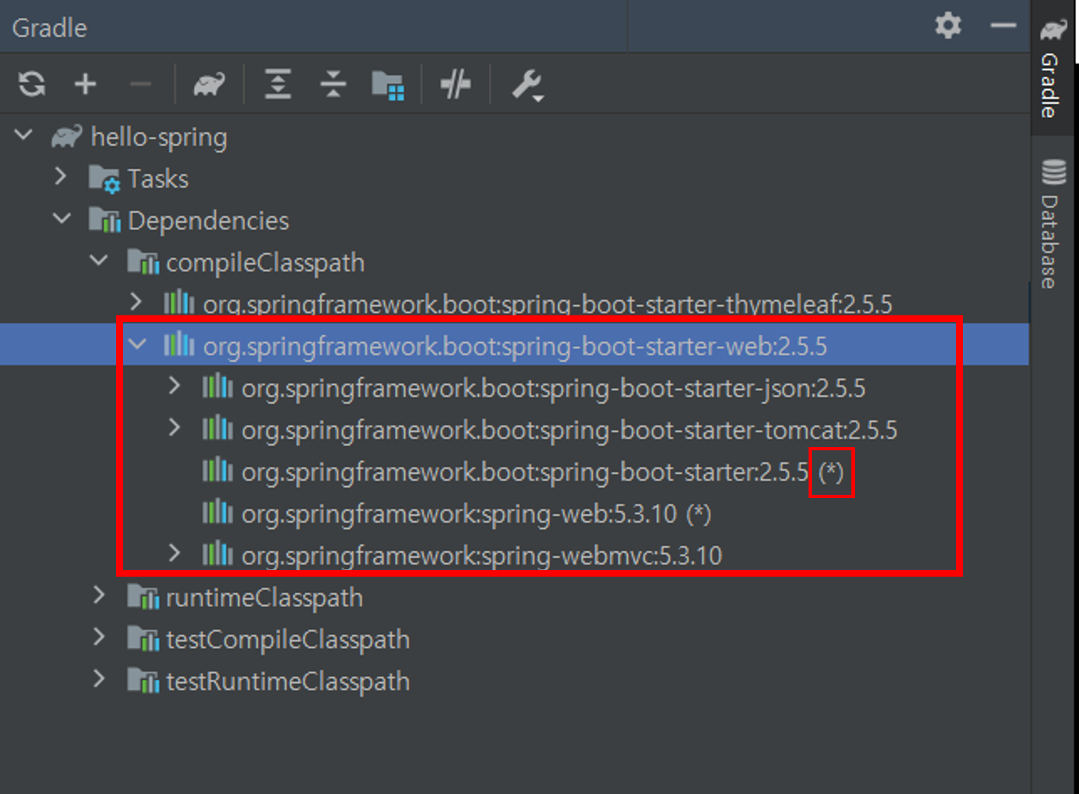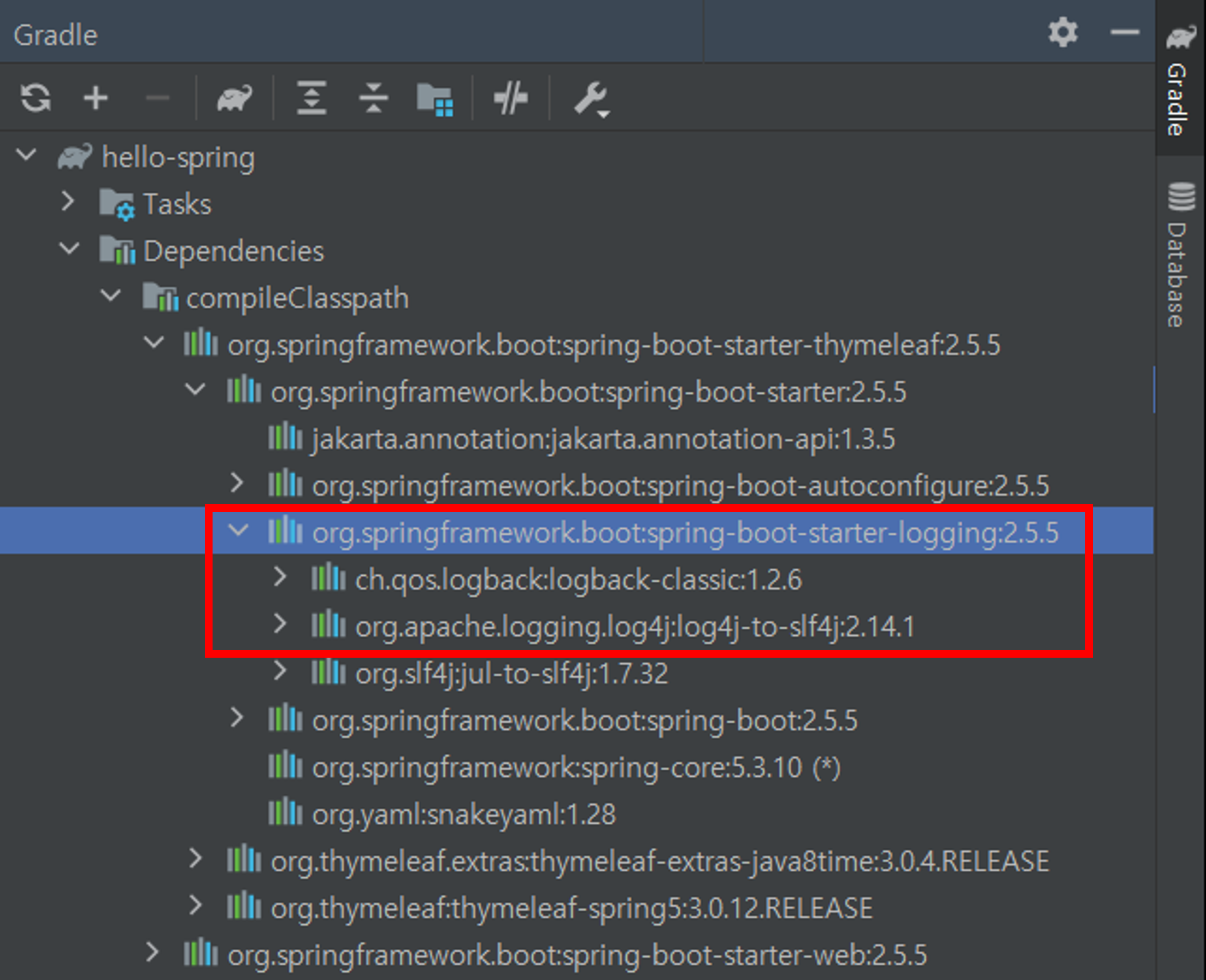 Gradle Dependencies 확인해보면 thymeleaf, starter-web 아래에 의존관계를 가지는 다른 라이브러리들 확인 가능